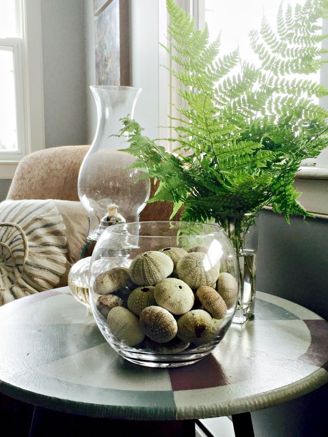 Living on the edge of the ocean, in a meadow with thick woods behind me is the perfect spot for foraging for bargain accents. I often combine sea related objects, some found and others hand crafted.